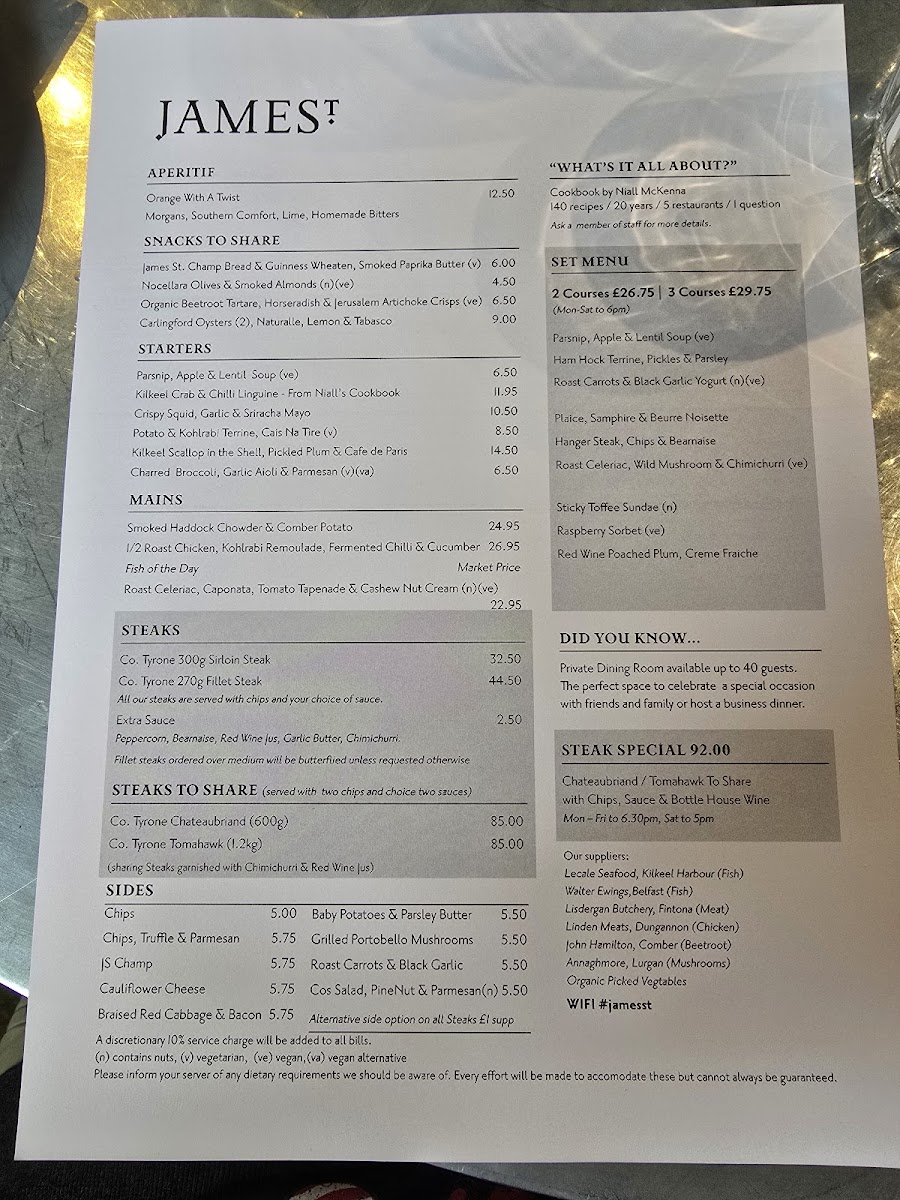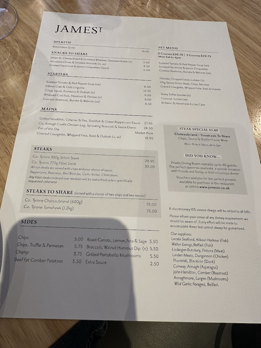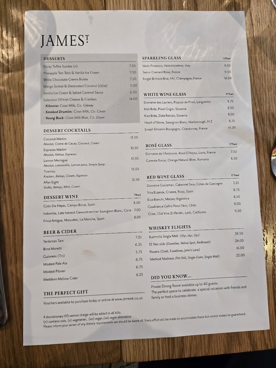 One standout feature of James St is the quality of its locally sourced ingredients, which shine in dishes such as the pan-seared duck breast and the seasonal vegetable risotto. The meat is cooked to perfection, tender on the inside with a crisp exterior, while the risotto offers a creamy texture complemented by vibrant seasonal vegetables. The diverse range of starters, mains, and sides demonstrates the restaurant’s commitment to showcasing Northern Irish produce at its best.