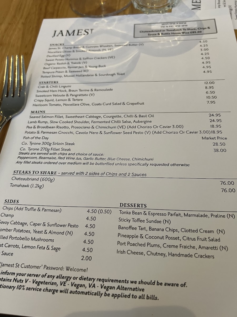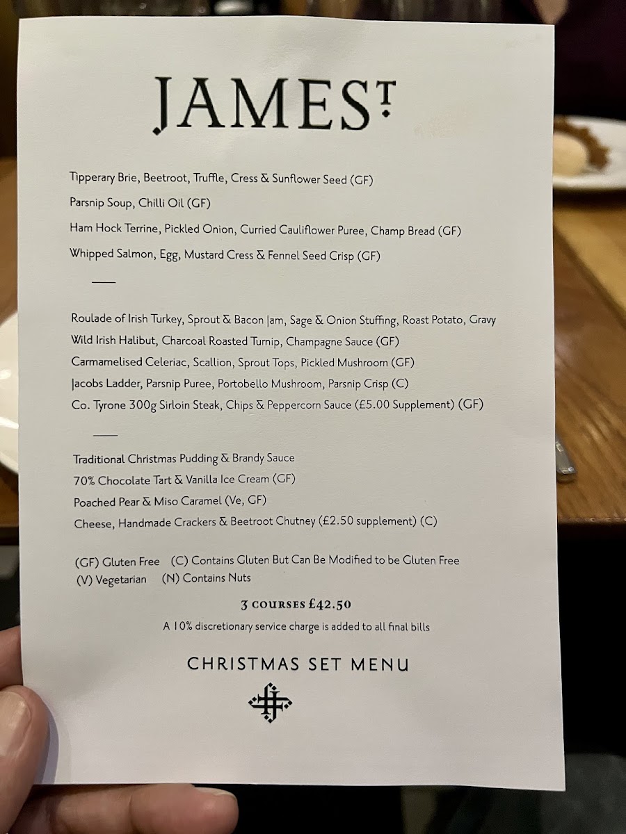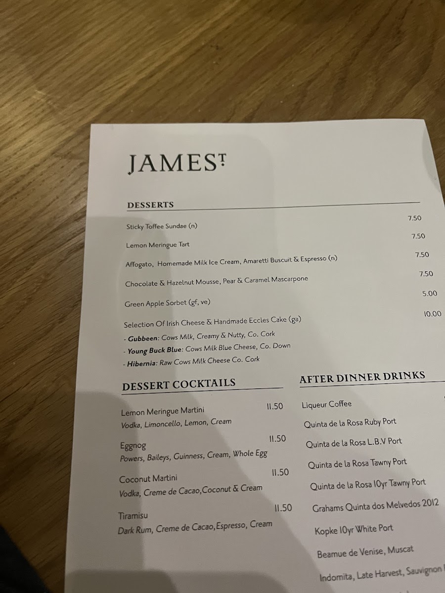 One standout feature of James St is the quality of its locally sourced ingredients, which shine in dishes such as the pan-seared duck breast and the seasonal vegetable risotto. The meat is cooked to perfection, tender on the inside with a crisp exterior, while the risotto offers a creamy texture complemented by vibrant seasonal vegetables. The diverse range of starters, mains, and sides demonstrates the restaurant’s commitment to showcasing Northern Irish produce at its best.